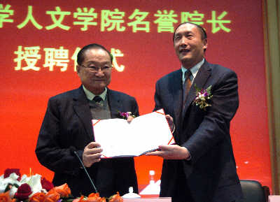 筆挺的黑西裝,黑亮的頭發(fā)整齊地后梳,昨日,83歲的金庸,氣定神閑地出現(xiàn)在浙江大學(xué)紫金港校區(qū)。雖然金庸口齒有些不清,走路也需要人攙扶,但絲毫不影響散發(fā)的英氣。他接過浙江大學(xué)校長楊衛(wèi)遞過的“名譽(yù)院長”聘書那一瞬間,意味著他正式卸任了浙大人文學(xué)院院長,可以靜心在英國讀書,并有望在未來的兩年內(nèi)拿到“貨真價實(shí)”的英國劍橋大學(xué)歷史學(xué)博士學(xué)位。