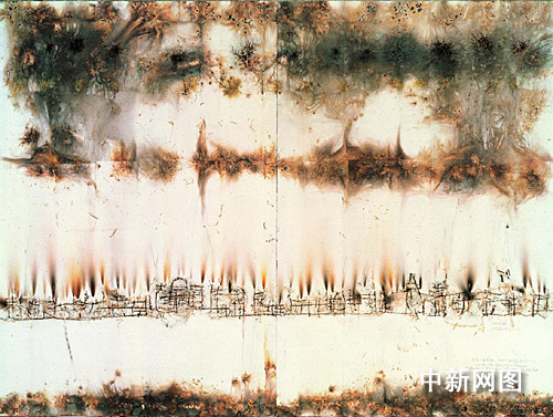 2001年10月,蔡國強為當(dāng)時在上海舉行的“亞太經(jīng)合組織會議”(APEC),動用了超過26,000 枚煙花火藥,上演了長達(dá)20分鐘的煙火爆破,獲得國內(nèi)外的高度贊揚。本次拍賣推出的《APEC景觀焰火表演十四幅草圖》,正是他在上海APEC爆破后,在宣紙上以爆破方法再現(xiàn)當(dāng)晚景況而創(chuàng)作的十四幅草圖。