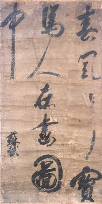 在中國書壇占有極重要地位的蘇軾,目前存世書法作品僅數(shù)十件,均藏于博物館,范圍也限于手卷、書帖、橫披等中小字形。“《春風(fēng)》這件姍姍來遲的‘大手筆’,彌補(bǔ)了因缺乏大幅作品而導(dǎo)致的蘇派書法體系的不完整。”徐啟雄昨天說,“數(shù)月前,一位外地收藏者帶藏品來杭州找我鑒定真?zhèn)!毙靻⑿弁嘎叮@幅僅存內(nèi)芯、名為《春風(fēng)》的中堂大軸草書高165厘米、寬65厘米,紙面發(fā)黃發(fā)暗,部分已腐化剝落,落款為“蘇軾”,另有“蘇軾”、“東坡居士”兩方隱約可辨的印章。上書“春風(fēng)寶馬人在畫圖中”,“春風(fēng)”后缺一字,其余每字高、寬在30-60厘米,最后的“中”字高62厘米。