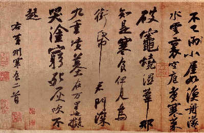 “蘇軾書作分早、中、晚三個時期:早年姿媚,中年圓勁,晚年豪放。就筆法看,《春風(fēng)》恣意揮發(fā),氣勢磅礴,飄逸豪放,當(dāng)屬晚年作品!毙靻⑿叟袛,《春風(fēng)》應(yīng)為蘇軾在“烏臺詩案”后被貶居惠州、海南,生活窘迫但仍受當(dāng)?shù)厝藷崆榻哟螅栽娫~、書畫回贈所為,因此得以在民間保存。