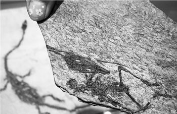 記者有幸在開展的第一時間看到了這件標本。這只像燕子般大小的史前動物,此時靜靜地躺在灰黑色的頁巖中,全身的化石骨架保存得完好而精美,全身的骨骼呈黑色,凸現(xiàn)在巖石上,清晰可見,煞是可愛。它的嘴巴尖長,嘴里看不到一顆牙齒,眼睛很大,前翅伸出,后肢舒展。它的發(fā)現(xiàn)者和主要研究者、中科院古脊椎所研究員汪筱林博士告訴記者,由于這只翼龍體型如此嬌小玲瓏,發(fā)現(xiàn)初期人們還無法判斷其個體發(fā)育年齡:是剛剛出生不久的“新生兒”,還是已經成長為“青少年”,或者已經進入成年?