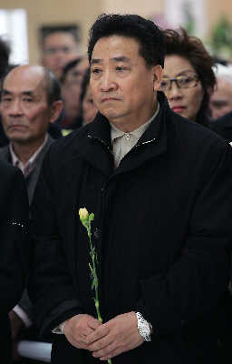 2點半,追悼會正式開始,大約600多位周柏春生前的摯親友好聚在大廳,為他送行。周柏春安詳?shù)靥稍邗r花叢中,接受大家的默哀和鞠躬。而此時,大廳門外的群眾已經(jīng)里三層外三層,很多人甚至難掩激動之情。