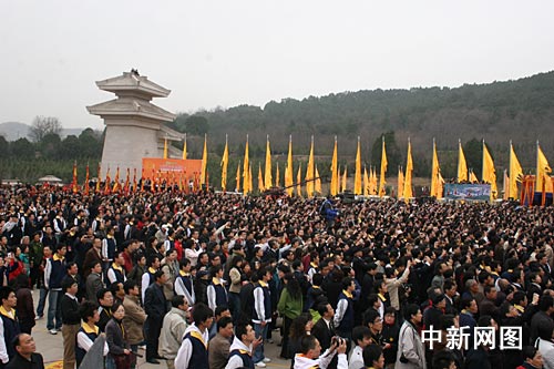 中新網(wǎng)黃陵4月4日電 (朱鵬英)2008年4月4日上午9時50分,戊子年清明公祭軒轅黃帝典禮在陜西黃陵縣橋山正式開始,來自海內(nèi)外的八千多名中華兒女聚集在黃帝陵前,共同祭拜中華民族的"人文始祖"軒轅黃帝,緬懷共同的先祖。