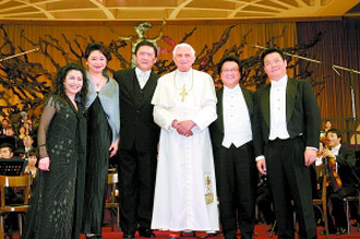 隨后,教皇走上舞臺(tái)與余隆和幾位歌唱家握手,并發(fā)表了5分鐘的演講,教皇表示昨晚的演出是一份稱心如意的禮物,“事實(shí)上這個(gè)音樂(lè)會(huì)在某種程度上讓我們接觸到中國(guó)社會(huì)活潑輕快的現(xiàn)實(shí),在這群出色的藝術(shù)家身上,我們可以看到他們所代表的偉大中國(guó)文化和音樂(lè)傳統(tǒng),他們的演繹也幫助我們更了解一個(gè)民族的歷史”。在講話最后,教皇竟然出人意料的用中文說(shuō)出“感謝大家并祝愿大家一切順利”,并主動(dòng)邀請(qǐng)幾位藝術(shù)家一起合影,這也是教皇回贈(zèng)給中國(guó)藝術(shù)家的禮物。