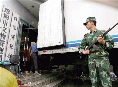 昨天,在荷槍實(shí)彈的武警押運(yùn)下,包括漢代說唱俑、搖錢樹等國寶在內(nèi)的6091件文物從綿陽博物館緊急轉(zhuǎn)移到廣漢三星堆遺址博物館庫房存放。因擔(dān)心唐家山堰塞湖可能潰壩導(dǎo)致洪水毀壞文物,綿陽博物館決定緊急轉(zhuǎn)移2.5萬件文物,當(dāng)天轉(zhuǎn)移了第一批。