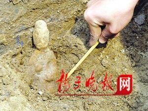 近期,在南京六朝古墓挖掘中,很少有文物出現(xiàn),基本上是“十墓九空”。在昨天下午的挖掘中,考古人員有比較大的信心。果然在挖到地磚甬道一側(cè)時,隨著考古人員手中小鏟刀輕輕一撥,一個陶俑人頭露出土面。接著是完整的身子,“頭上戴著官帽,是一尊男性陶俑,高大約20多厘米!痹谶@尊陶俑的旁邊,還睡著一尊陶俑,兩手抱在胸前,但頭已不知去向,身旁還有幾枚銅錢,考古人員將于今天對陶俑繼續(xù)清理挖掘。一位考古人員一邊清理,一邊介紹,“商周時期習慣用活人殉葬,春秋戰(zhàn)國逐漸用模擬活人的俑來代替,其中用陶泥制作,經(jīng)火燒成的人物形象即為陶俑。陶俑有文武官吏、樂隊儀仗、男仆女侍等。在墳墓中陪葬死者的陶質(zhì)人形,是為了炫耀墓主人生前的身份、財富、精神信仰!彼f,應當在墓門前甬道兩側(cè)各放一尊陶俑,另一尊可能被破壞了。