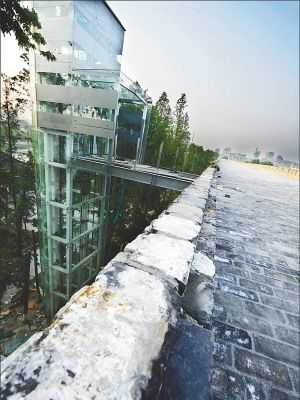 “前幾天這里已經(jīng)建好了一個(gè)圓柱形的電梯井,井壁是綠色透明的玻璃,聽(tīng)當(dāng)時(shí)正在施工的工作人員說(shuō),這里要建一個(gè)觀光直達(dá)電梯!奔易∥涠ㄩT(mén)附近的一位南京市民董先生當(dāng)時(shí)對(duì)早報(bào)記者表示,明城墻已經(jīng)進(jìn)入世界物質(zhì)文化遺產(chǎn)預(yù)備名單,與國(guó)內(nèi)其他幾個(gè)城市的明城墻捆綁申遺,“如果在這兒建一個(gè)現(xiàn)代化的電梯,這樣的古城墻還能申遺成功嗎?”