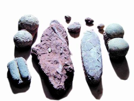 “這是村民們開山修筑趙營村至金花村‘村村通’公路時發(fā)現(xiàn)的。”張豐臣說,“目前,僅新修公路沿線兩公里范圍內(nèi)就發(fā)現(xiàn)有二十多窩這樣的恐龍蛋化石,估計實際蘊藏量不下100窩。同時還發(fā)現(xiàn)了樹枝蛋、戈壁棱柱形蛋等十多種恐龍蛋化石!痹诖宀浚瑥堌S臣向記者展示了臨時保存的修路施工中拾到的蛋化石和龍骨化石。