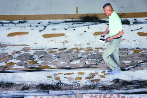 進入中央展廳,占據(jù)整面墻壁的是他一周前剛剛創(chuàng)作的火藥畫《歷史足跡:為北京奧運作的計劃》,這是對他設(shè)計的奧運會開幕式29個焰火腳印從永定門走進“鳥巢”的宏偉場景的再現(xiàn),觀眾可以從中辨認出腳印下方的人民大會堂、天壇、鳥巢、水立方等標志性建筑。