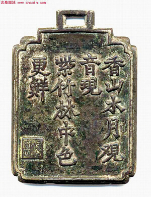 “香山水月觀音現(xiàn),紫竹林中色更鮮!弊蛉,一塊刻有無(wú)名詩(shī)句的清代古銅牌現(xiàn)身渝北區(qū)。對(duì)此牌,收藏界有兩種說(shuō)法。一說(shuō),此牌是“名妓號(hào)牌”;二說(shuō),是當(dāng)時(shí)某地下組織的“會(huì)員證”。