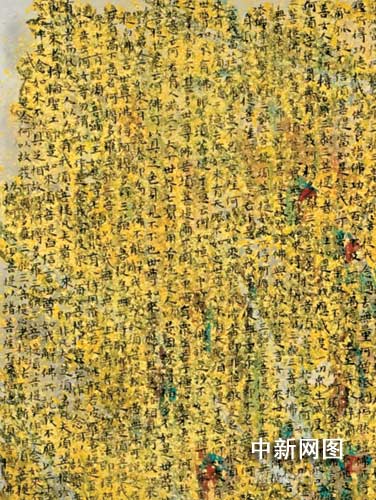 這種表現(xiàn)手法,還體現(xiàn)在文字系列的組畫上。龐舜堯是中國書法家協(xié)會會員,長年抄寫佛經(jīng),書法舒朗雋秀,富有禪意。該組繪畫由細小的《金剛經(jīng)》文字組成,將文字作為畫面的肌理,遠觀是現(xiàn)代風格的抽象畫,近看則是由細小的佛經(jīng)文字組成。據(jù)龐舜堯介紹,最大的一副作品,由3萬個工楷寫滿,整個創(chuàng)作持續(xù)了將近一年多的時間。