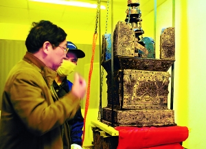 昨天下午3時(shí)28分,南京市博物館和晨光集團(tuán)的專家成功地將長干寺“塔王”請出鐵函。從8月6日在鐵函內(nèi)發(fā)現(xiàn)寶塔,到昨天借助機(jī)械手請出寶塔,專家小組經(jīng)過整整109天的研究論證和科技攻關(guān),終于將迄今為止世界上發(fā)現(xiàn)的體積最大的阿育王塔完整地呈現(xiàn)在世人眼前。