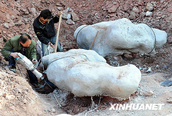 在汝陽縣劉店鄉(xiāng)圣水溝村,工作人員將挖掘出的大型恐龍化石經(jīng)過科學(xué)分割后打上石膏,以便妥善保存(12月1日攝)。新華社記者 王頌 攝