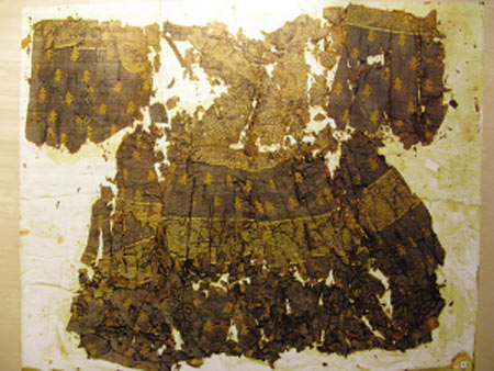 這件萬歷龍袍在地下埋藏了整整300年。1958年5月,考古人員打開了北京明十三陵中的定陵地宮,從明代萬歷皇帝朱翊鈞和他的兩個皇后棺木中出土了3000多件隨葬器物,有富麗堂皇的金銀器、價值連城的珠寶玉器、精美絕倫的青花瓷器和絢麗多采的羅紗織錦,出土的龍袍、皇冠和鳳冠更是引人注目。這件龍袍,是萬歷皇帝為了追求“天衣無縫”,而令天下能工巧匠打造的絕世精品,出土?xí)r部分仍然有色彩,紋飾還閃閃發(fā)光。