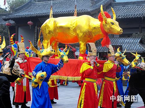 “從農歷初一到十五,宋城新春大廟會即將隆重啟幕。‘鞭打春!@個活動就是為了讓更多的市民了解所用的‘金牛’是特別從外地訂做的,身長三尺六寸五,象征一年365天;牛尾長一尺二寸,象征一年12個月。單單牛頭就長80公分,十分地高大威猛,將勞動八個大漢才能將其抬出來。”杭州宋城景區(qū)的有關負責人介紹說。