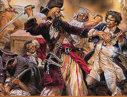 作為加勒比海盜的領(lǐng)軍人物之一,黑胡子見證了加勒比海盜的興起。黑胡子原名愛德華 蒂奇,1680年出生于英國(guó),十幾歲時(shí)他便登上一條英國(guó)海盜船當(dāng)了一個(gè)小海盜,這條海盜船擁有英國(guó)政府頒發(fā)的私掠許可證,因此可以在英國(guó)政府庇護(hù)下攻擊和掠奪敵對(duì)國(guó)家的商船。成年后,愛德華留起了一臉濃密的黑胡子,有時(shí)還會(huì)編成小辮,由此他獲得了黑胡子的綽號(hào)。據(jù)說,他力大如牛、酒量過人,可以在一整天海戰(zhàn)后,豪飲一夜朗姆酒,然后精神百倍地再次投入廝殺;因?yàn)橄恿倚缘睦誓肪撇粔騽,他還常常要在酒里灑上一把火藥。