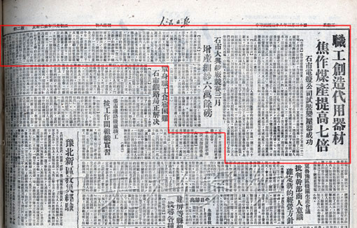 3. 1949年3月30日,《人民日?qǐng)?bào)》關(guān)于焦作煤產(chǎn)提高七倍及石市紗廠增產(chǎn)細(xì)紗六萬(wàn)余磅的報(bào)道