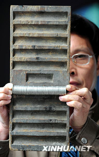 據(jù)介紹,這塊清代使用的“點鈔機”狀似算盤,長37厘米,寬16厘米,內(nèi)刻有11條凹槽,直徑同當(dāng)時流通的銅幣直徑吻合,其中10條長凹槽可一次性勘驗1000枚銅幣,中部的一條短凹槽可勘驗50枚銅幣。新華社記者彭張青攝