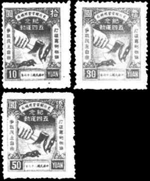 1947年5月4日,解放區(qū)東北郵電管理局發(fā)行紀(jì)念五四運(yùn)動郵票1套3枚,分綠、淡棕、紫色三色,面值分別為10元、30元、50元。主圖為一支巨手持斧砍斷象征專制統(tǒng)治的鎖鏈,兩側(cè)空白邊框內(nèi)為兩條標(biāo)語:“打破專制枷鎖”,“爭取民主自由”。這套郵票的設(shè)計(jì)者是張修平,他曾參考俄國十月革命后發(fā)行的郵票圖案,巨手握著寶劍砍斷鎖鏈,象征無產(chǎn)階級革命沖毀資本主義枷鎖。
