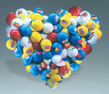 構(gòu)思不同、表達(dá)多樣的100多件雕塑,從不同角度展現(xiàn)了地震中人性的堅強與抗?fàn)帯H缪嗌酱髮W(xué)藝術(shù)學(xué)院教師吳新的浮雕作品《我們的畢業(yè)照》,展現(xiàn)的是一張老師缺席的畢業(yè)照,作者為地震中老師的犧牲精神所感動,并期望將這種感動傳達(dá)給觀眾。西安美術(shù)學(xué)院雕塑系教授周曉東的作品《茂汶蘋果》,雕刻了一個特殊的蘋果,裂了口的蘋果上描繪了重建后的家園圖。他說,是四川人都熟知的汶川和茂縣的土特產(chǎn)蘋果給了他表達(dá)的沖動。親自去過災(zāi)區(qū)的周曉東深深地體會到地震中人們的心理障礙,“許多人根本無法面對親人的忽然離去。”所以他更愿意用樂觀的蘋果去感染人的情緒,讓他們感受到生的希望,因為,比自然災(zāi)難更可怕的是人的絕望。天津美術(shù)學(xué)院學(xué)生韓帥、宋曉燕、李鵬共同創(chuàng)作的作品《關(guān)愛》,將貼有各國國旗的五彩安全帽組合成心形,既使觀眾重溫了國際救援愛心行動帶來的希望與感動,也不禁為“80后”藝術(shù)家的巧妙構(gòu)思而叫好。