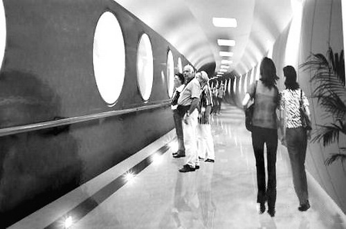 水下博物館在水下40米處,環(huán)境極為特殊。要進(jìn)入水下博物館,必須要經(jīng)過一個(gè)和乘飛機(jī)類似的安檢程序。之后踏上一條長(zhǎng)88米的電梯,進(jìn)入水深40米處。再通過一條約150米的平直交通走廊,在邁過一道寬約一米、厚約半米的鋼制艙門后,進(jìn)入到60多米長(zhǎng)的環(huán)形參觀走廊。