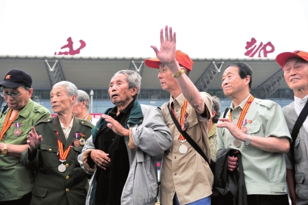 16時許,這批年齡都在80余歲左右的“四川老兵”陸續(xù)來到了報社門口集合。大家的表情顯得有些興奮,雖然是臨時接到接機的通知,老人們還是精心準備了一番,每個人都戴上了建川博物館送給他們的紀念抗日戰(zhàn)爭勝利60周年徽章,82歲的王世雨老人的左胸上,更是戴滿了記錄著他崢嶸軍旅生涯的各式獎章。