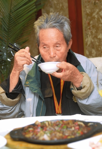 回鍋肉、麻婆豆腐,老人看著桌上地道的川菜有點發(fā)呆,低頭,聞聞。“外公,吃塊回鍋肉。”吃上家鄉(xiāng)的肉,老人一定覺得那肉香似曾相識!皝恚覀儦g迎老兵回家!憋堊郎,大家共同舉杯祝福,歡迎老人回家。