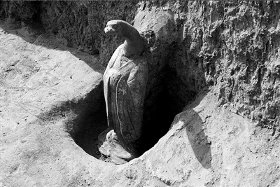 根據(jù)目前的考古資料,兩京(長安、洛陽)地區(qū)唐墓中所見最早、最完整的一組十二生肖俑出土于西安南郊開元二十四年(736年)唐兵部常選孫承嗣和夫人高氏合葬墓,俑高約25厘米。十二生肖俑在初唐晚期和盛唐時代墓葬中時有發(fā)現(xiàn),但在墓葬圍溝中出土卻極為稀見,這可能代表著更高級別的一種喪葬制度。考古專家認為,西安咸陽機場考古工地這次發(fā)現(xiàn)的十二生肖俑群組合基本完整,體量巨大,造型優(yōu)美,出土位置明確,是一組研究唐代喪葬制度和雕塑藝術不可多得的珍貴資料。