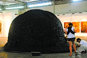 藝術(shù)家原弓將大卡車直接拉進(jìn)了展廳正中最醒目的位置,一開場就讓觀眾將視角對(duì)準(zhǔn)了汶川地震。熊貓人趙半狄也來湊了個(gè)熱鬧,展出了其2008年給災(zāi)區(qū)孩子送彩色熊貓的紀(jì)實(shí)圖片。2009年圓明園鼠兔獸事件讓傅文俊的作品對(duì)準(zhǔn)圓明園十二生肖獸首。
