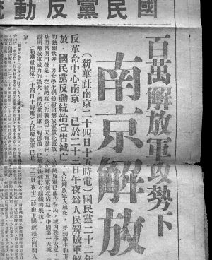 在人民解放軍的強大攻勢下,國民黨南京政府土崩瓦解,黨政官員倉皇南逃,駐防南京及蘇南各地的國民黨軍紛紛棄守而逃。各城市地下黨組織根據(jù)事先的布置,組織共產(chǎn)黨員和積極分子維護城市秩序,熱烈歡迎解放軍的到來。解放軍第8兵團第35軍于23日午夜進占“總統(tǒng)府”。5月1日,中共中央電賀南京解放,指出:“人民解放軍第二、第三兩大野戰(zhàn)軍執(zhí)行人民解放軍總部司令,奮勇前進,橫渡長江,敵軍望風披靡,南京迅獲解放,國民黨反動派統(tǒng)治從此宣告滅亡,江南千百萬人民迅即重見天日,全國歡騰,環(huán)球鼓舞!