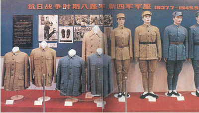 抗戰(zhàn)爆發(fā)后,紅軍改編為八路軍、新四軍,服裝、標(biāo)志基本與國民黨軍隊(duì)相同。八路軍、新四軍都佩戴“青天白日”帽徽,但臂章上卻清楚地標(biāo)明了自己的身份。八路軍佩戴“八路”長方形臂章,新四軍佩戴“新四軍”或“N4A”的臂章。八路軍的軍服顏色多為土黃色,新四軍多為灰色。