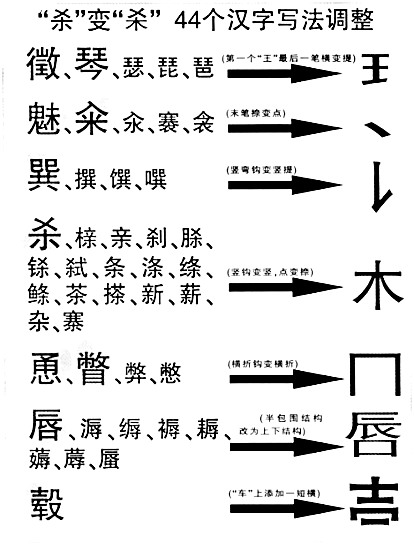 一些網(wǎng)友認(rèn)為,調(diào)整漢字如果只注重美感,就把傳統(tǒng)的東西丟掉了。比如“殺”字,本身下面像鉤像矛,有“殺氣”,下面改成“木”后,感覺就變了。專家解釋,這次調(diào)整字形有些地方參考了臺(tái)灣的字形。