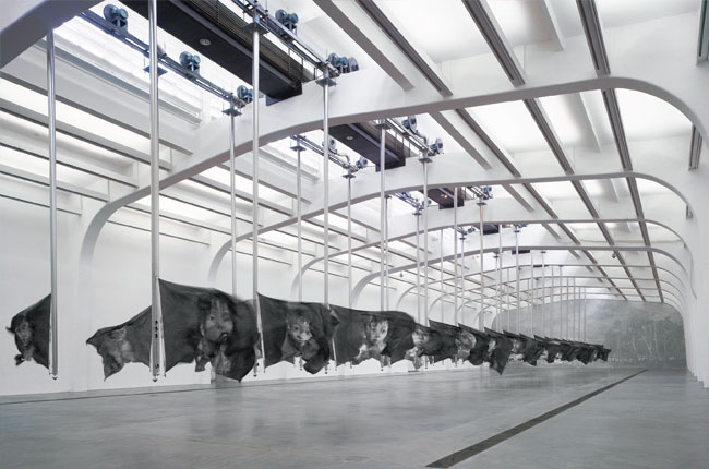 每天晚7點是尤倫斯當(dāng)代藝術(shù)館閉館的時間。大展廳里震耳欲聾地響了一整天的鼓風(fēng)機(jī)停了。34 幅被吹得呼啦啦飄揚(yáng)的旗幟以及旗幟上34 張嬰兒的臉也隨著風(fēng)力消失,癱軟下來,耷拉在旗桿上。仿佛大退潮,展廳盡頭的灰色風(fēng)景墻露了出來,那面墻上畫著沒有人煙的山頭。遠(yuǎn)望去,旗桿如墳?zāi)股系钠鞄,遍插山地?/p>