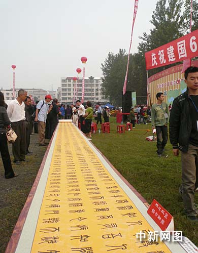 中新社襄樊9月29日電 (涂玉國)長一百一十米、寬零點八米,用五種字體書寫的毛主席詩詞的書法長卷,二十九日在湖北省襄樊市谷城縣博覽會上現(xiàn)身。這是該縣文化館副館長、書法美術(shù)家協(xié)會主席許祥強(qiáng)為慶祝新中國成立六十周年而作。