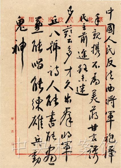 1949年 9月 1日,馮玉祥遇難周年祭日追悼會(huì)在北京舉行,出席者有李濟(jì)深、宋慶齡、周恩來、沈鈞儒、張瀾、何香凝、郭沫若、林伯渠、吳玉章、董必武及馮玉祥夫人李德全等 600余人。毛澤東、朱德及各民主黨派、各人民團(tuán)體送了挽聯(lián)花圈。毛澤東親筆題詞: “馮玉祥將軍逝世周年紀(jì)念謹(jǐn)致悼意。 ”周恩來在致詞中說:馮玉祥先生從一個(gè)典型的舊軍人轉(zhuǎn)變成為一個(gè)民主的軍人,他經(jīng)過了曲折的道路,最后走向新民主主義的中國。馮先生堅(jiān)決地拒絕了美帝國主義對他的誘惑,毅然離美準(zhǔn)備回到中國解放區(qū),接受參加新政治協(xié)商會(huì)議的號(hào)召,不幸遇難,實(shí)值得大家紀(jì)念。