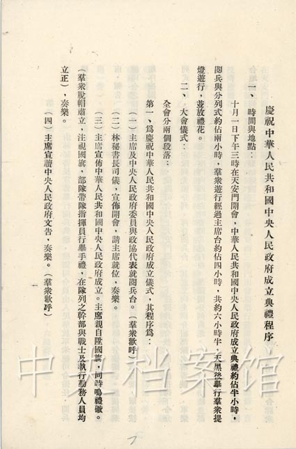 1949年1O月1日下午2時(shí),中華人民共和國(guó)中央人民政府委員會(huì)召開第一次會(huì)議。會(huì)上毛澤東宣布中央人民政府主席、副主席和委員就職,中華人民共和國(guó)中央人民政府成立。3時(shí),中華人民共和國(guó)中央人民政府舉行成立典禮。參加典禮的有中國(guó)人民政治協(xié)商會(huì)議全體代表和首都各工廠職工、學(xué)校師生、機(jī)關(guān)人員、市民、近郊農(nóng)民和城防部隊(duì)共3O萬人。中央人民政府主席、副主席、各委員就位,樂隊(duì)奏國(guó)歌。