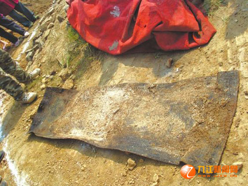 第二天上午記者聞?dòng)嵹s到現(xiàn)場(chǎng),見到一座五六米高的土坡被掘去一半,古墓的白灰空洞懸在土坡切面的半腰處,棺木散落在土方旁。泥地上有一大攤水漬,有人提醒道,別踩著,那是從棺材里流出來的水。女尸已被人用廢舊的紅地毯裹卷著,停放在不遠(yuǎn)處的平地上,旁邊還有一張潮濕的舊篾席。后來獲知席子原先墊于尸首下,是從棺木中取出的。仔細(xì)一打量,篾席上長時(shí)間壓出的人形痕跡清晰可見。圍觀的人越來越多,不時(shí)有人上前,欲掀開地毯一睹新奇,好在兩個(gè)民警一旁維持秩序,好事者才不敢妄動(dòng)。