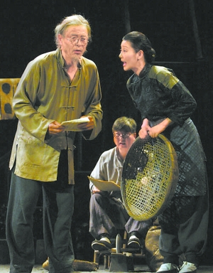 畢竟作者是初次染指舞臺(tái)劇,臺(tái)詞俏皮生動(dòng),人物個(gè)性鮮明,大段大段的“獨(dú)白”卻像是在寫小說。小說往往容許單管獨(dú)奏,或花開數(shù)朵各表一枝,戲劇除獨(dú)角戲外,必定是十指彈琴,彼此呼應(yīng)。幸虧何冰是一位壓得住臺(tái)的優(yōu)秀演員,那熱力四射的情感深度與舞臺(tái)張力,將大段大段的臺(tái)詞化成旁若無(wú)人的心靈傾訴,挽救了眾人臺(tái)詞空白的尷尬。也幸虧導(dǎo)演林兆華故意犯禁的巧妙處理,以群體角色靜默不動(dòng)或極少動(dòng)作,反襯苑大頭的情感井噴;以表現(xiàn)性的非現(xiàn)實(shí)場(chǎng)面,處理這一反常的劇作和生活情態(tài),出乎意表地使第三幕后段反而成為全劇最具特色的舞臺(tái)處理,從而使寫實(shí)與非寫實(shí)的界限變得模糊,或者說開拓了寫實(shí)主義戲劇更為寬闊的表現(xiàn)空間。 (林克歡)