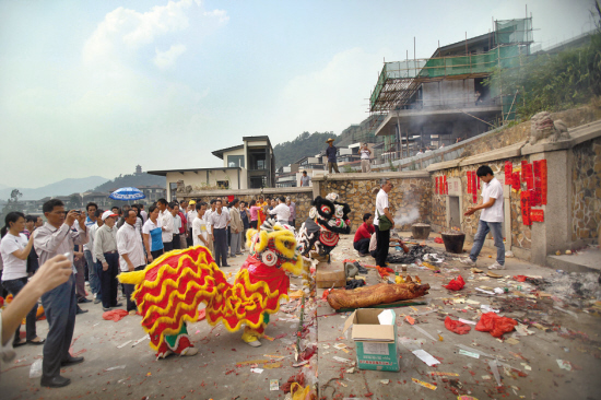 古墓前站滿了各地前來祭祖的男女老少,更有許多人一大早從廣西岑溪趕來,祭祖的儀式熱鬧而有序,舞獅在伴奏之下騰挪起伏,而曾氏后裔也有序地上前行禮敬香,人們在拜祭之后有序離開。