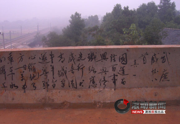 “太有才了!如此流暢的書(shū)法作品,的確為鐵路建設(shè)增色不少!本W(wǎng)友“龍?zhí)t”在紅網(wǎng)論壇發(fā)《水泥墻上見(jiàn)功底武廣橋上一奇葩》,帖中曝料他在武廣高速鐵路客運(yùn)專(zhuān)線(xiàn)上的一跨線(xiàn)橋的擋墻上,拍到建橋人如行云流水一般的書(shū)法作品。據(jù)當(dāng)?shù)刂槿苏f(shuō),這些書(shū)法作品是其中一位承建包工頭建完橋后有感而書(shū)的。
