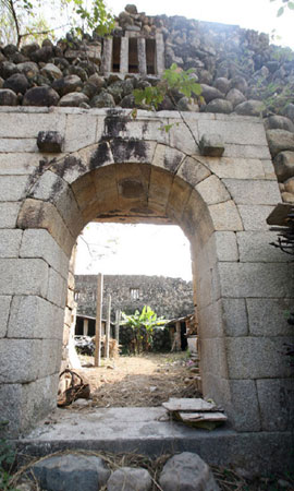 石堡是一個長方形建筑,長37米、寬31米,墻體內(nèi)外全是用鵝卵石及條石砌成,歷經(jīng)數(shù)百年風(fēng)雨,雖說已經(jīng)沒有了屋頂,只留下高約8米的墻基,但依然雄偉屹立。石堡的三面是護厝房,外墻也是石頭,但內(nèi)墻是由土夯成的,非常牢固,石堡大門上陰刻“懷珠”兩字。