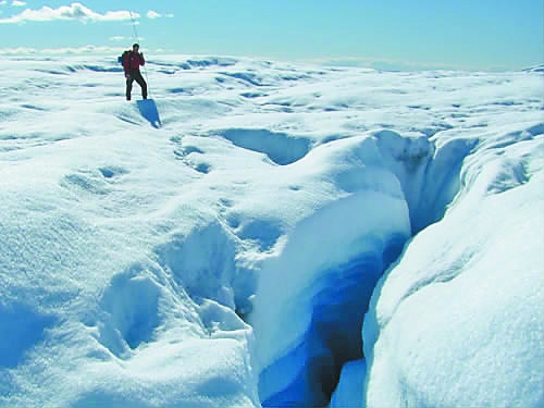 隨著氣候變暖,許多冰蓋開(kāi)始融化,冰融水形成了一條條溪流。這些溪流最終又會(huì)流入冰川鍋穴之中。冰川鍋穴就是冰川中近于直立的井穴或洞穴,是由冰面因融化等原因坍落而形成。人們站在這樣的冰面上,可以聽(tīng)到巨大的水流聲,可以明顯感受到危險(xiǎn)的存在。如果落入冰川鍋穴之中,你將會(huì)永遠(yuǎn)被埋于冰層之下。冰融水流入冰川鍋穴后還會(huì)起到一種潤(rùn)滑作用,促使冰川向大海加速移動(dòng),最終整個(gè)冰川消失于海水之中。