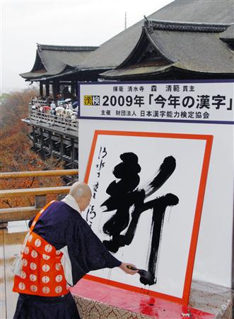 中新社東京十二月十一日電 日本十一日在京都著名古剎清水寺公布慣例的“今年的漢字”評(píng)選結(jié)果,“新”字當(dāng)選為描繪二00九年的世象“代言人”。