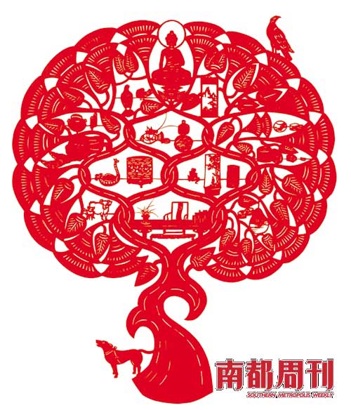 袁荃猷女士刻的這幀“大樹圖”剪紙,形象勾畫出了王世襄一生的15種愛好,這其中有代表王世襄最主要學術成就的漆器,還有王世襄使之死而復生的傳統(tǒng)工藝竹刻、葫蘆器,還有繪畫、鎏金銅佛像、蟋蟀、家常菜、大鷹、獾狗等。