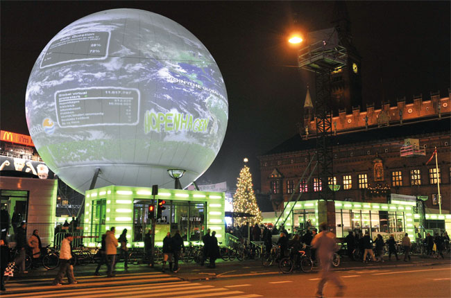 12 月7 日,記者抵達(dá)哥本哈根。據(jù)說(shuō),有大約1200 輛豪華汽車、140 架私人飛機(jī)以及數(shù)萬(wàn)人涌入哥本哈根,為此,丹麥政府不得不為會(huì)議購(gòu)買價(jià)值60 萬(wàn)歐元的“碳積分”。中國(guó)和美國(guó)成為會(huì)場(chǎng)里最受關(guān)注的焦點(diǎn)。而在會(huì)場(chǎng)外,到處可見環(huán)保人士的環(huán)保秀,來(lái)自小島國(guó)代表的示威抗議也此起彼伏。此時(shí),受人矚目的哥本哈根變成了一個(gè)環(huán)!按笮銏(chǎng)”。