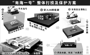 經(jīng)過(guò)多次論證,專(zhuān)家們比較傾向采用“沉箱式”整體打撈方案,即用鋼板將沉船整體包住,再用鋼釬從船底穿過(guò),潛水員在海底進(jìn)行打鉚和焊接,最后將沉船整體打撈出水。整體打撈首先必須要把沉箱壓到海底扣住整條船,如果扣不住就沒(méi)有辦法穿底梁,底部不封閉,不可能打撈。水下考古中心隊(duì)員魏俊說(shuō):“在這個(gè)過(guò)程中,我們又遇到了一些難題:第一個(gè)沉箱下壓,需要多大的壓力,才能到位?第二,壓下去之后,淤泥沒(méi)有了,只有海水,這樣會(huì)不會(huì)使原有的船由于周?chē)h(huán)境的改變而遭到損壞;第三,這個(gè)箱子封閉以后怎么把它吊起來(lái)?”