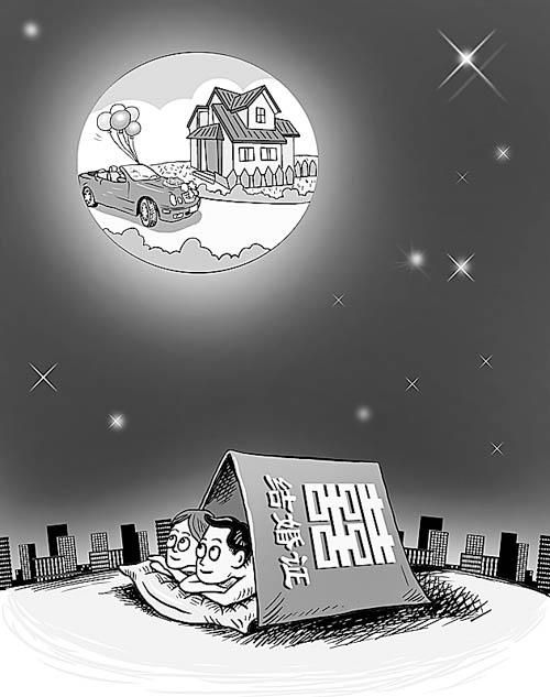 不買房,不買車,不辦婚禮,不買婚戒……除了花九塊錢去登記處辦理紅艷艷的結(jié)婚證,其他都可以不要。近來,網(wǎng)絡上的一篇題為“一個裸婚者的自白”的帖子,引發(fā)網(wǎng)友關注!奥慊椤,這個在2008年全球金融危機下誕生的新詞兒,在2009年不斷上揚的房價“助推”下迅速流行。新浪網(wǎng)網(wǎng)友“同道”稱,“‘裸婚’是高房價賜給白領的‘新時尚’。”