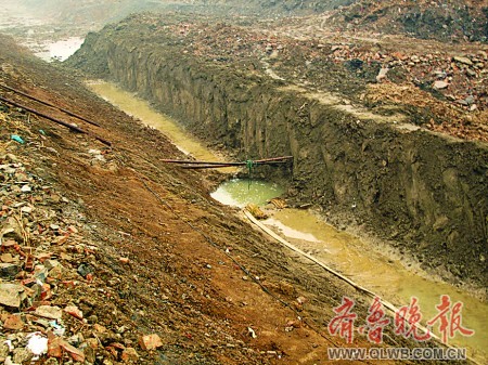 記者20日來到發(fā)現(xiàn)古墓的工地。因為下雨,工地中一片泥濘。這個剛被挖出的宋元古墓在一條東西走向的河溝溝底,距離地面約五六米,墓口用兩根棍子示意。起初,墓穴的外形還比較明顯,隨著河溝一側的雨水向墓穴匯去,幾十分鐘的工夫便被淹沒了。