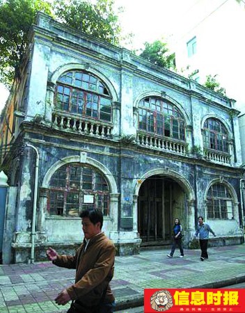 現(xiàn)狀:門前的拱形外廊由12根木柱支撐,建筑四周已經(jīng)被鐵欄隔開,成為“禁區(qū)”,早在2001年就被定為危房,一直沒有修葺。