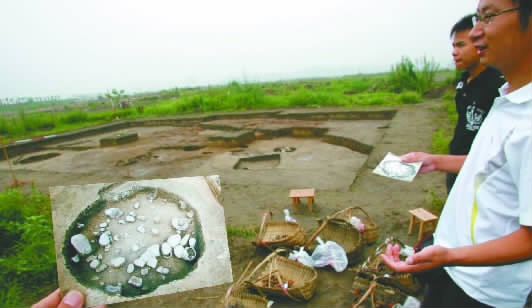 去年7月,本報(bào)記者前往發(fā)掘現(xiàn)場采訪,當(dāng)時(shí)已從遺址中發(fā)掘出眾多陶器碎片,還有一些無法辨別材質(zhì)的物品,其神秘性為剛剛開始發(fā)掘的遺址留下懸念。在隨后的發(fā)掘過程中,省文物考古研究院除調(diào)集本院的大量專業(yè)人員外,還邀請和組織了包括北京大學(xué)、南京大學(xué)、四川大學(xué)、重慶市文物考古研究所等單位的專業(yè)技術(shù)人員。